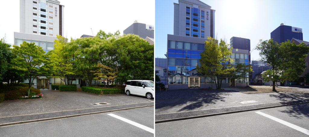 一部の特徴となる樹木を残し、新社屋でも緑との共生が継続できるように工夫しています。